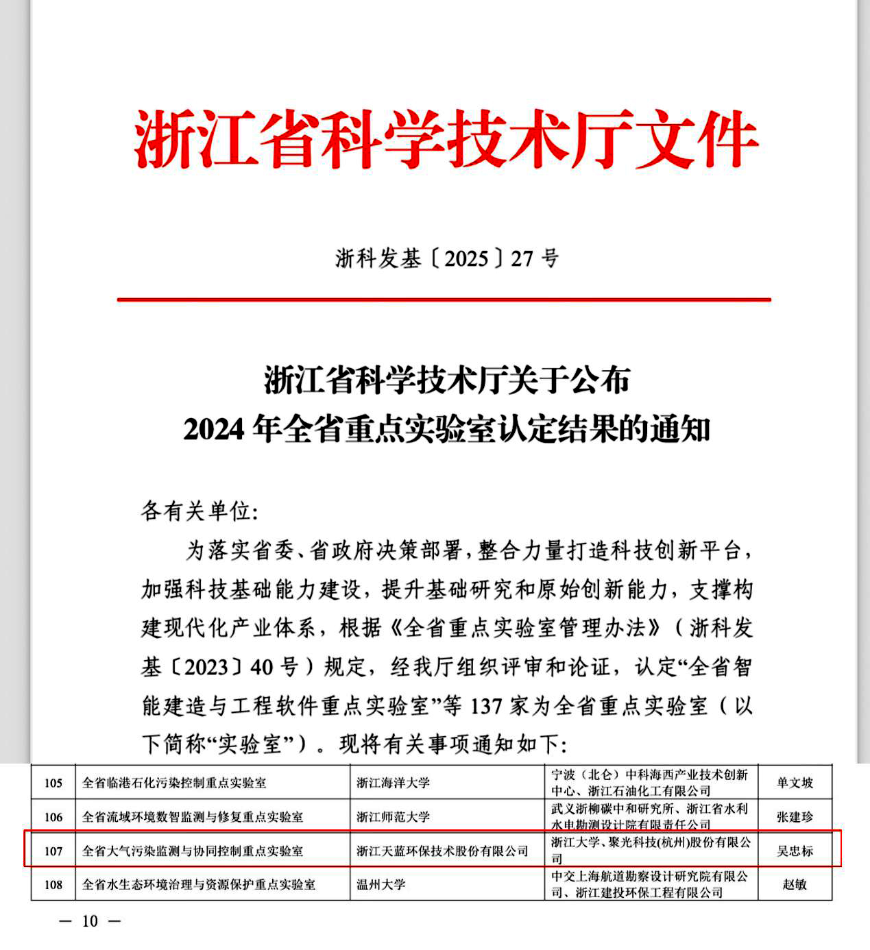 2025年6月4日,浙江省科技廳發(fā)布《浙江省科學(xué)技術(shù)廳關(guān)于公布2024 年全省重點(diǎn)實(shí)驗(yàn)室認(rèn)定結(jié)果的通知(浙科發(fā)基〔2025〕27號(hào))》,由浙江天藍(lán)環(huán)保技術(shù)股份有限公司牽頭,浙江大學(xué)和聚光科技(杭州)股份有限公司共建的“全省大氣污染監(jiān)測與協(xié)同控制重點(diǎn)實(shí)驗(yàn)室”獲批組建,成為全省環(huán)境領(lǐng)域唯一以企業(yè)牽頭建設(shè)的省級(jí)重點(diǎn)實(shí)驗(yàn)室。